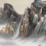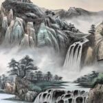 传统中国山水画风格,水墨笔触描绘悬崖松柏与山间亭阁,意境深远,禅意浓厚。适合茶室、中式书房、会所等空间。