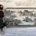 亭阁临水,松柏掩映,烟波浩渺间一叶轻舟。承袭中国传统山水写意之精神,以油画语言重新诠释,既有水墨之留白,亦有油彩之厚润。